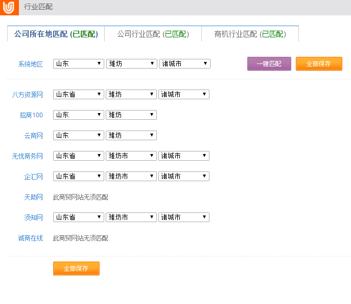 一步:匹配公司所在地 ,先進行系統匹配設置再一鍵匹配,部分選項出現需要手動匹配,這個時候手動匹配一下,選擇精準,最后全部保存。