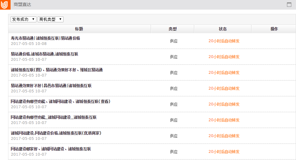 最多顯示1500條商機信息,商機發布成功后48小時內轉發獨 家站群,發布成功效果立顯,隨機顯示10個網站,可隨時換一批查看。